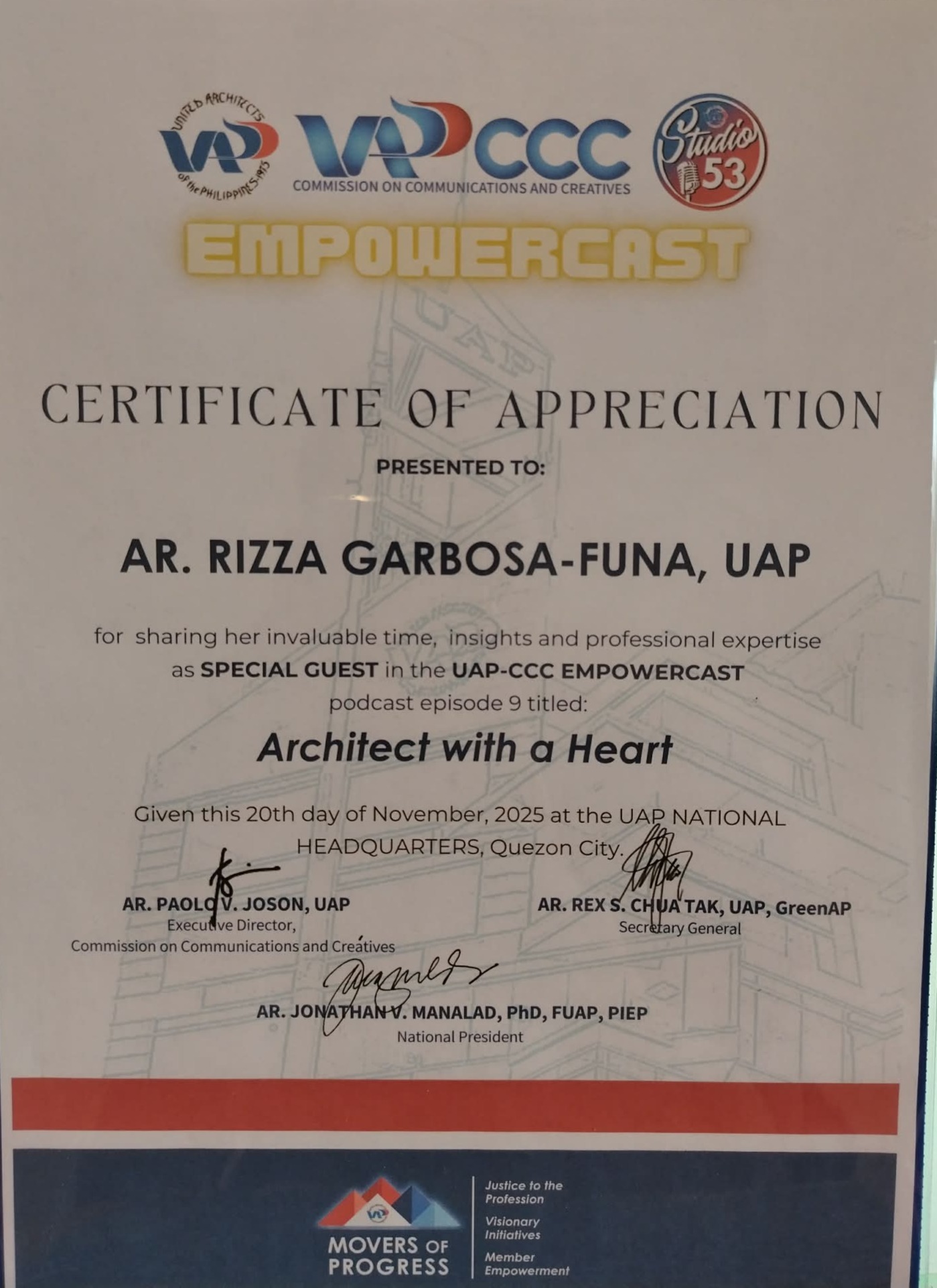 Invited as a Special Guest to UAP-CCC EMPOWERCAST Episode 9, contributing time, insights, and professional expertise to the architectural community.