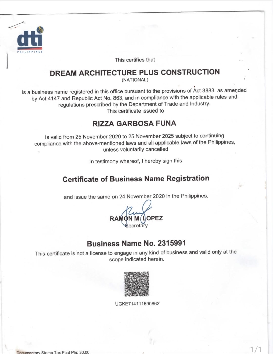 A DTI-registered business name, officially compliant with Philippine laws and regulations, operating as a legitimate architectural and construction service provider.